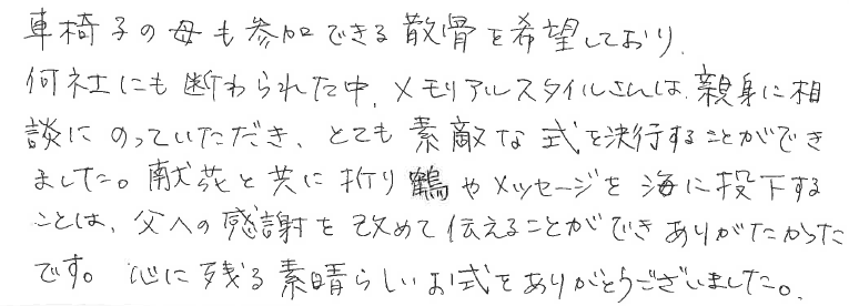 桟橋でお母様乗船時、車いすを持ち上げるお手伝いをさせていただいただけですが、